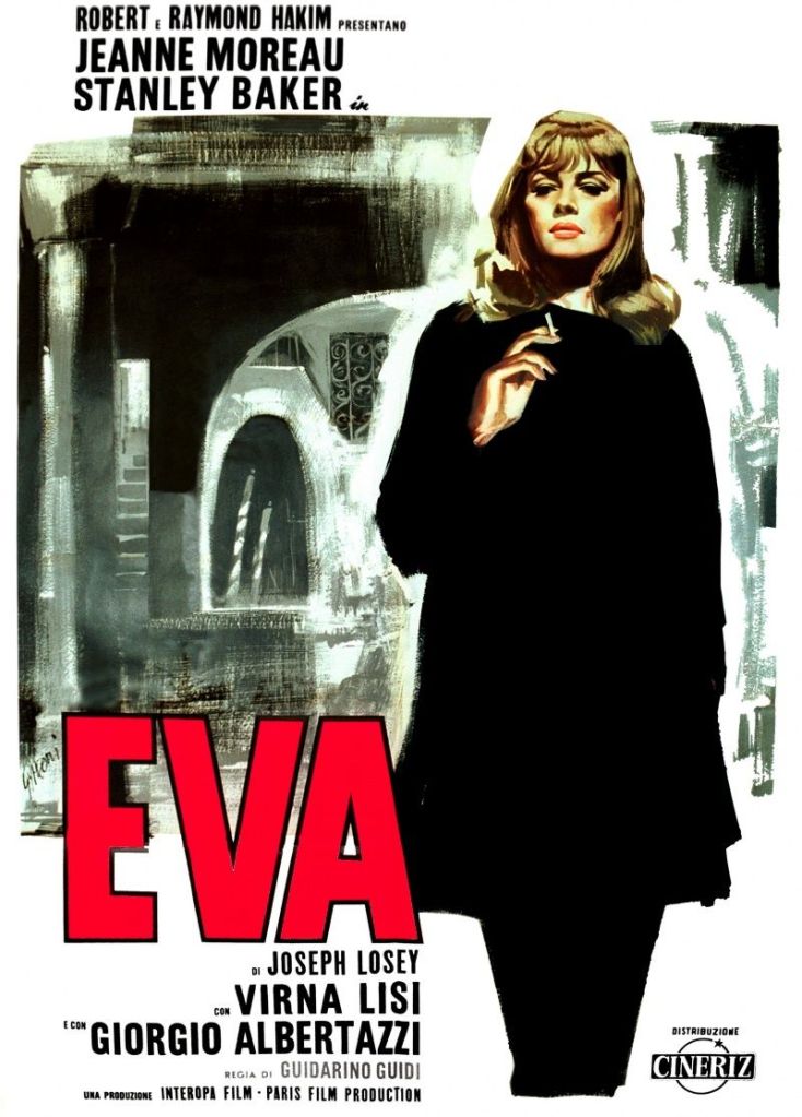 Eva (Jeanne Moreau) está sentada em um café na Praça São Marcos. Seu belo rosto reflete em um espelho de mão. Tyvian (Stanley Baker) se aproxima, diz algo ao seu ouvido, mas é repelido. Ele se afasta, dizendo que vai esperá-la no bar. Corta para plano geral da praça ainda vazia nesta manhã de inverno. Corta para plano mais próximo, lenta panorâmica passeia pela praça, mostra o canal, as gôndolas ancoradas, a câmera continua em seu giro, agora na avenida que margeia o canal, a ponte de um dos pequenos canais ao fundo, até terminar na escultura encravada em um dos prédios. Entra locução em off: “E ao oriente do Jardim do Éden colocou querubins com uma espada de chamas que revolvia para guardar o caminho da árvore da vida”.
