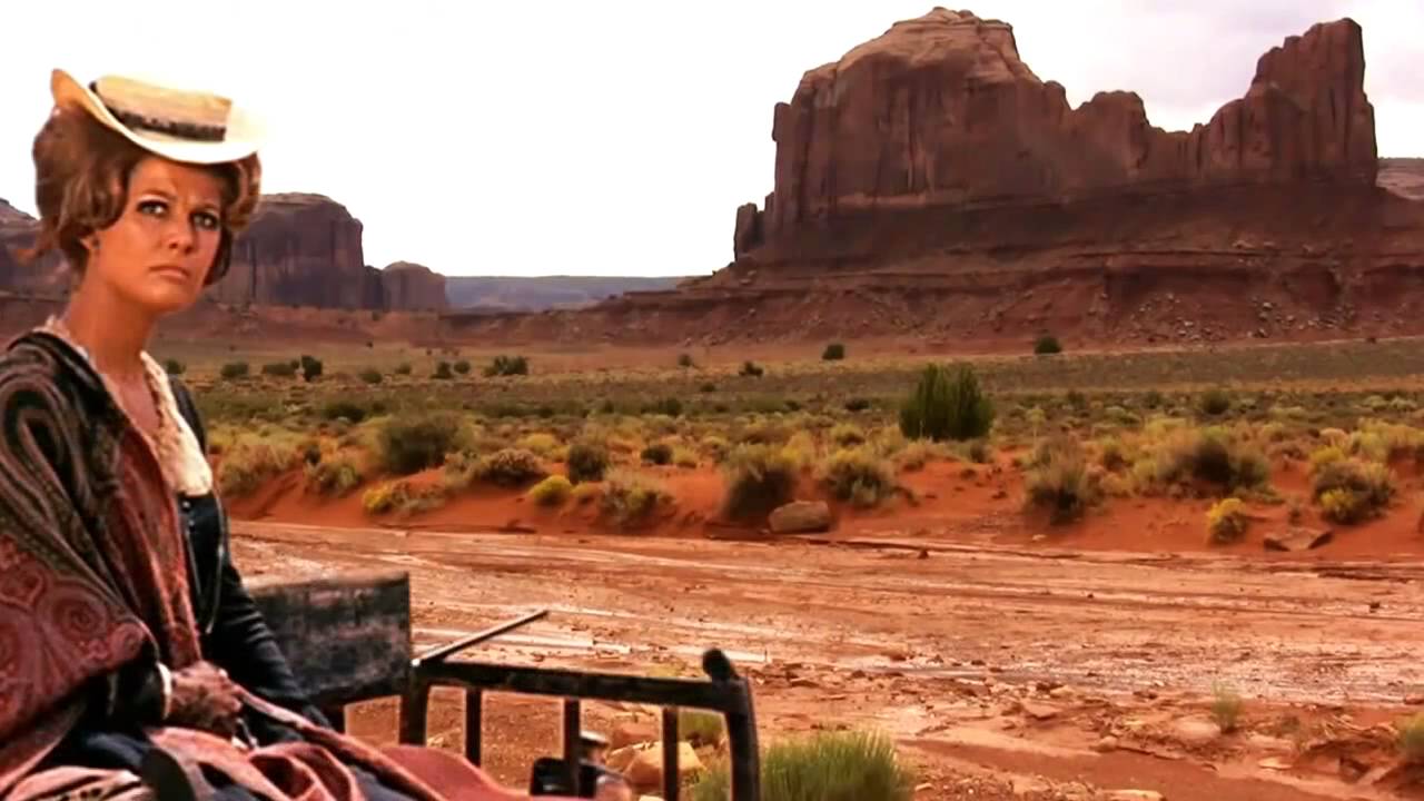 Imagem difusa misturada com fumaça. Plano fechado de frente no trem chegando na estação. Claudia Cardinale aparece na porta do trem, de vestido e chapéu – a mulher do leste – tem um sorriso nos lábios. Desce as escadas, anda pela plataforma à procura de alguém. Caminha pela plataforma ao lado de várias pessoas. A estação movimentada. Ela espera. Olha para o relógio na parede. Close em seu rosto. A música de Ennio Morricone começa a tocar. Ela desiste de esperar. Caminha até o hall de entrada da estação, Entra. A câmera não entra, segue mostrando a parede até parar na janela. A câmera parada na moldura da janela mostra Claudia Cardinalle atravessando a entrada, pedindo informações ao funcionário. A atriz sai pela porta do outro lado. Pelo vidro da porta vê-se a cidade ao fundo. A câmera sobe pela parede do cômodo, passa pelo telhado velho e desgastado. A inesquecível música de Ennio Morricone cresce, toma conta da cena. À medida que a câmera passa pelo telhado, em direção ao céu, vê-se a cidade em construção do outro lado da estação de trem: pessoas, cavalos, charretes, poeira, Claudia Cardinale caminhando pela rua. A visão do oeste bravio e desolado para uma mulher do leste. O oeste de Sergio Leone, uma lenda.